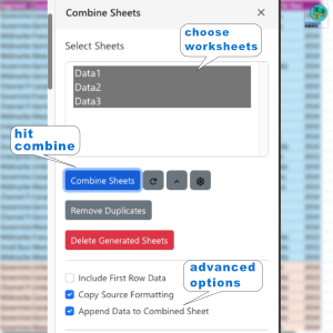 Combine Sheets is easy tool to combine multiple worksheets into one. Follow the source format or Append to existing or remove Duplicates. Everything on a click..
